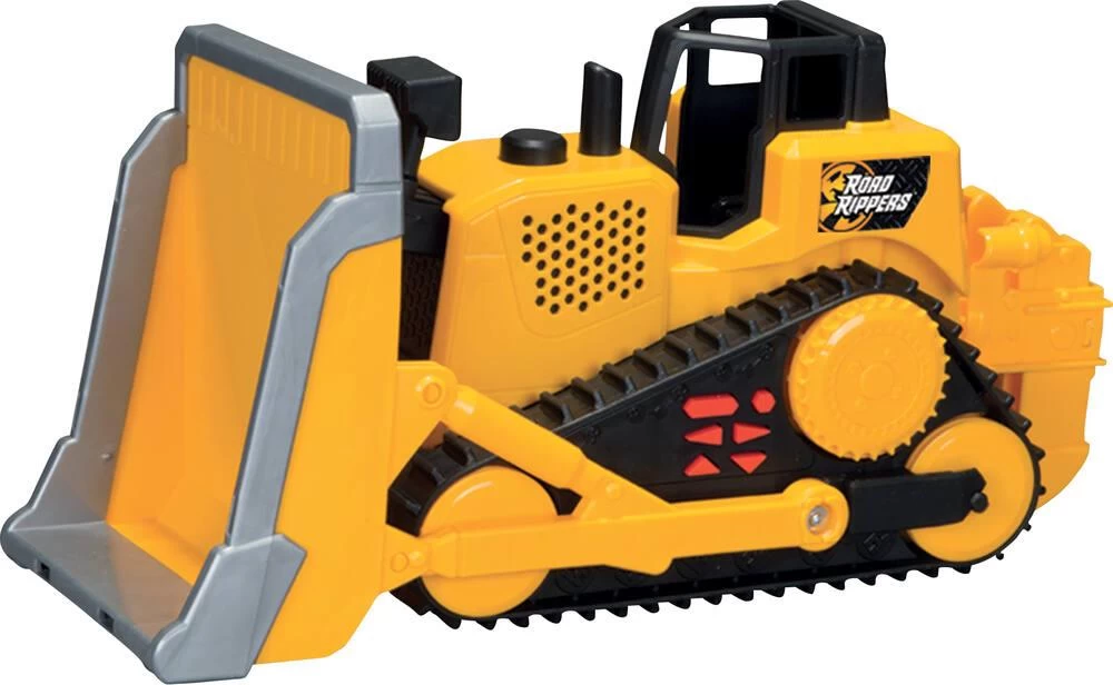 Bulldozer motorisé Avec effets sonores et lumineux : lumières, des voix (en anglais), des bruits de moteur et d’alarme de recul, et de la musique. Appuie sur les boutons sur le côté de l’engin de construction pour activer le véhicule et découvrir ses fonctions. Marche avant et arrière ! Lumières et sons ! La pelle à l’avant monte et descend ! 3 piles LR6 fournies. Instructions imprimée sur la boîte.