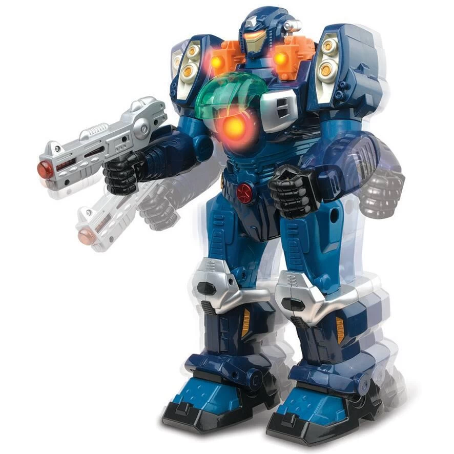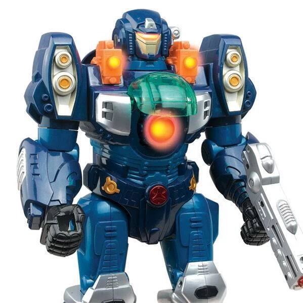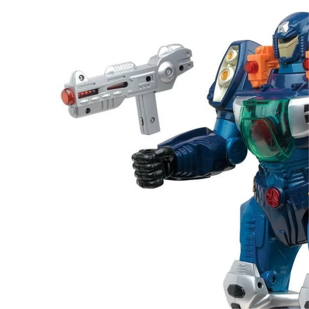 Super robot motorisé de 30 cm. Il marche avec des lumières clignotantes et des sons. Le couvercle transparent situé sur sa poitrine s’ouvre automatiquement en même temps que les lumières de son arme clignotent. Bras à articulations multiples. Le pistolet qu’il a dans sa main est amovible. 3 piles LR6 fournies.