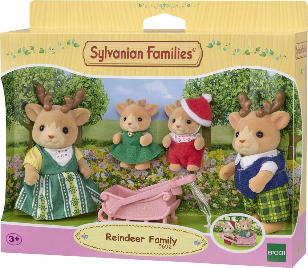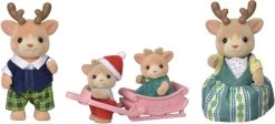 La famille Renne est composée de 4 personnages : 1 maman Renne, 1 papa Renne, 2 bébés Renne, 1 traineau – Ils sont tous articulés et habillés avec soin. Leurs vêtements peuvent être enlevés et remis à loisir.