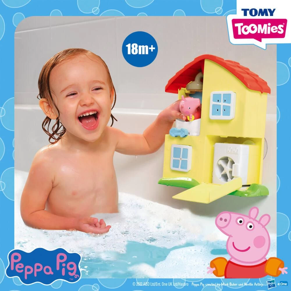 Attendez-vous à des grognements bruyants et à beaucoup de rires, à la facon de Peppa Pig, avec cette maison pour le bain de Toomies. Spécialement concue pour que les petits se sentent à l’aise dans l’eau, ils n’auront d’yeux que pour la maison de Peppa, qu’ils exploreront de haut en bas. Ce centre d’activités astucieux s’adapte facilement au carrelage ou à la baignoire grâce aux ventouses situées à l’arrière. Les fenêtres sont magiques car elles s’ouvrent et font apparaître deux verseurs. Utilisez-les pour verser de l’eau dans le toit et regardez la douche s’animer ! … Mettez Peppa Pig dans sa baignoire sur mesure et lavez-la bien ! Le rez-de-chaussée renferme une autre surprise : le mur s’ouvre sur la machine à laver de Peppa. Une fois que la baignoire de Peppa est remplie d’eau, faites glisser la flèche pour envoyer l’eau dans le tuyau et faire tourner le tambour de la machine à laver. La figurine de Peppa Pig est douce et souple, elle flotte et se transforme en gicleur rigolo. Lorsqu’il est l’heure de ranger, les petits s’amusent à trier les formes et remettent les fenêtres verseurs dans les fentes triangulaire et circulaire. Ce playset pour le bain La maison fait partie de la gamme de jouets Peppa Pig de Toomies. Il encourage le jeu de rôle collaboratif, affine les compétences motrices et explore les séquences de cause à effet, tout en aidant les petits à se sentir en confiance dans l’eau – Pour une utilisation optimale, nos jouets doivent être appliqués sur une paroi de bain ou un carrelage sec. Videz l’eau du jouet après utilisation et laissez-le sécher à l’air libre. Nettoyez le jouet régulièrement en le rincant soigneusement à l’aide d’une solution antibactérienne ou stérilisante. Pas besoin de piles. Convient aux enfants de 18 mois et plus – IMPORTANT : Nous savons que l’installation de jouets à ventouses peut être délicate, nous sommes donc là pour vous aider – Nettoyer : Commencez par utiliser une surface dégagée, assurez-vous qu’elle est lisse et non texturée, puis nettoyez la paroi de la baignoire ou le carrelage avec un nettoyant multi-usages. Assurez-vous que la surface est sèche : Séchez la surface avec un chiffon. Pour une utilisation optimale, nos jouets doivent être appliqués sur une paroi de bain ou un carrelage sec. Utiliser un peu d’eau : Mouillez les ventouses avec un peu d’eau, retirez l’excédent d’eau en les secouant mais ne les séchez pas complètement – Appuyer : Appuyez fermement les ventouses du jouet sur la baignoire ou le carrelage. Assurez-vous qu’il n’y a pas de bulles d’air importantes. Maintenez en place pendant 10 secondes. S’il glisse, essayez à nouveau. Soutien : Bien que nos jouets puissent être fixés directement sur la baignoire, pour de meilleurs résultats, nous recommandons de les fixer sur le carrelage en utilisant le rebord de la baignoire comme support, en veillant à éviter les joints. Attendre : Pour de meilleurs résultats, nous suggérons de laisser les ventouses se fixer pendant au moins une heure avant d’utiliser le jouet – À la maison dans le bain : Le playset pour le bain La maison de Peppa déborde d’idées brillantes, avec sa propre baignoire et sa douche fonctionnelle à l’étage et une machine à laver qui tourne au rez-de-chaussée – Une cascade d’amusement : Chaque fenêtre carrée dissimule un verseur différent avec un profil unique pour s’amuser à trier les formes : l’une cache un triangle, l’autre un cercle – Mettez Pegga Pig dans le bain : À l’aide d’une fenêtre verseur, versez de l’eau dans le toit et voyez la douche s’animer et remplir la baignoire ! Faites glisser le bouton pour envoyer l’eau dans le tuyau et faire tourner la machine à laver – IMPORTANT : Appliquez sur une surface SÈCHE (paroi de la baignoire ou carrelage lisse) avant de remplir la baignoire ou d’ajouter de l’eau dans le jouet ! Ainsi, la maison de Peppa est sûre de rester bien en place – Renforce la confiance : Parfait pour les petites mains, ce jouet pour le bain développe la confiance dans l’eau, la narration et la motricité fine tout en explorant les relations de cause à effet – À collectionner : Fait partie de la collection de jouets Peppa Pig de Toomies, concue pour suivre le rythme de croissance de votre enfant – Pas besoin de piles.