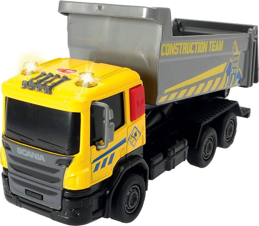 Véhicule Scania à roues libres. 3 modèles assortis : camion-benne, camion toupie à ciment et camion grue. Véhicule miniature fidèle à l’original et doté d’une cabine Scania Die-Cast (en métal). Avec effets sonores et lumineux. Avec des pièces mobiles, exemples : pour le camion benne, la benne bascule ; pour le camion toupie, la toupie tourne grâce à une manivelle ; et pour le camion grue, la grue est télescopique. En métal et plastique. Dimensions : camion benne 15.5 x 5.5 x 7 cm, camion citerne 16.5 x 5.5 x 7.8 cm, camion grue 16 x 5.5 x 8 cm. Modèle selon disponibilité. Vendu à l’unité. Age recommandé : 3-5 ans.