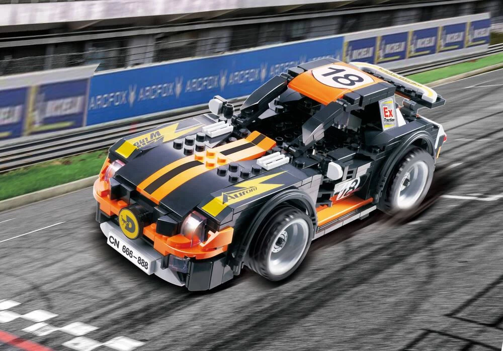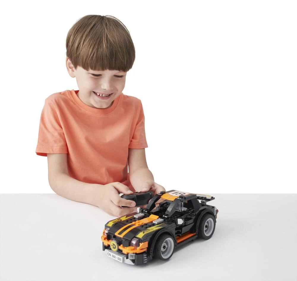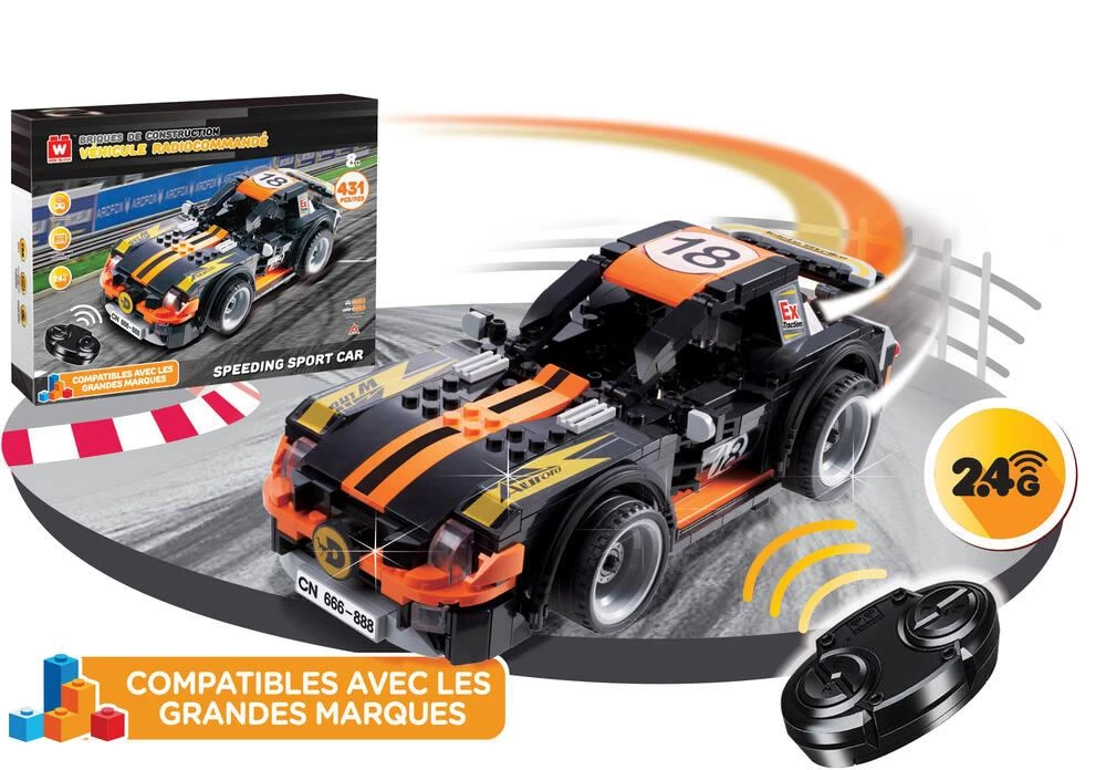 Rentre dans l’univers des véhicules de course avec ce modèle Sport. Un design très réaliste, des briques compatibles avec les grandes marques, et 431 pcs à assembler pour partir sur les chapeaux de roues avec ce véhicule radiocommandé ! Les enfants pourront ainsi développer leur imagination et leur créativité, et affronter leurs adversaires dans des courses impitoyables. Stickers inclus pour personnaliser le véhicule. Exclusif : ce véhicule radiocommandé avance facilement grâce à sa petite télécommande multi fonctions. Fonctionne avec des piles.