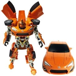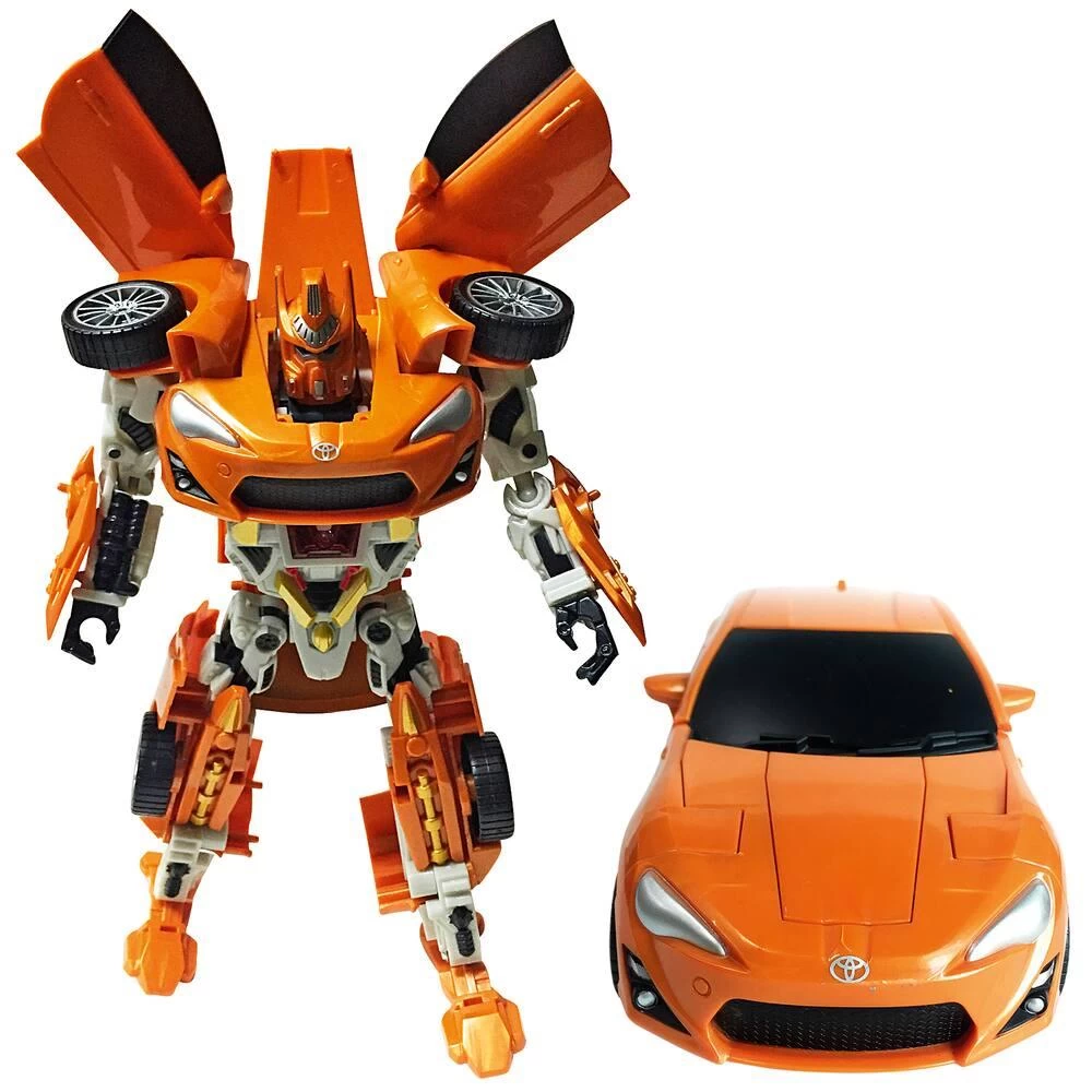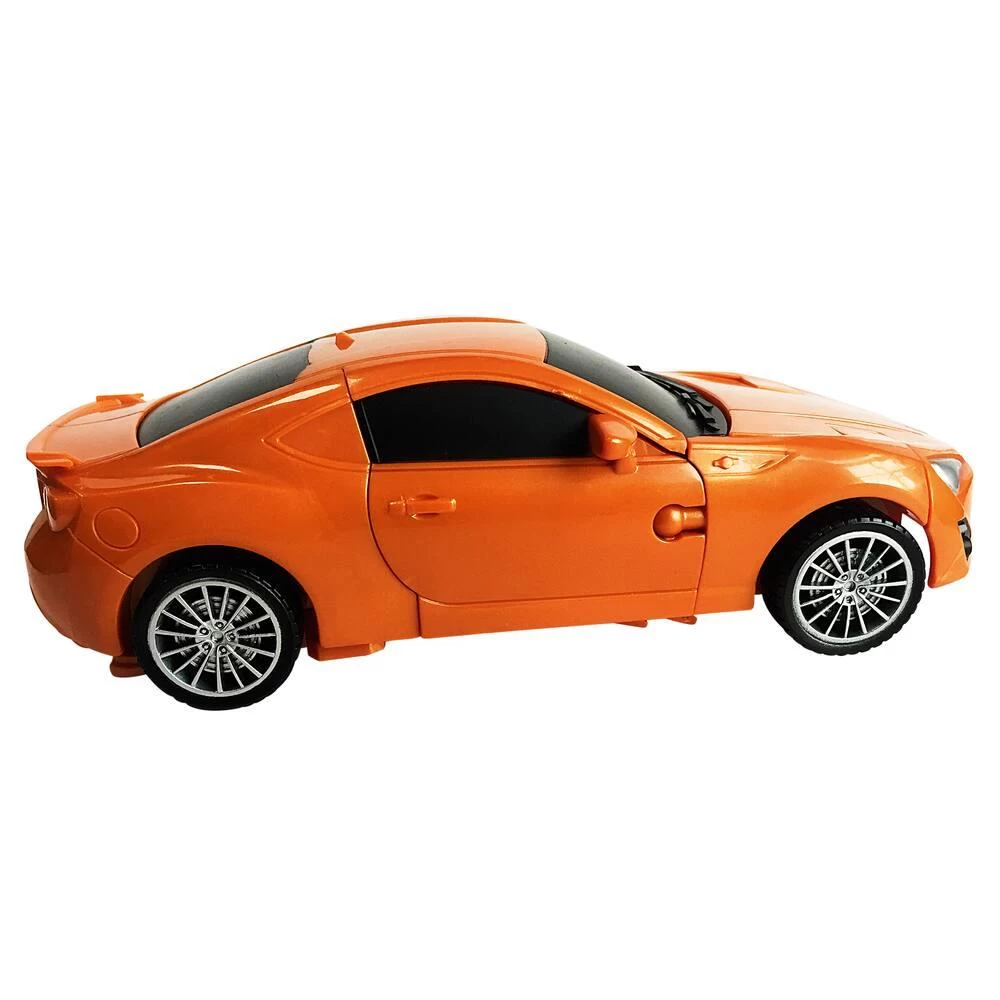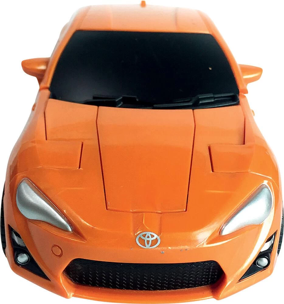 Véhicule transformable en robot avec effets sonores et lumineux : bruit de démarrage, de klaxon et de moteur, roues libres, en plastique. Les instructions pour la transformation sont inscrites sur la boîte. Echelle 1/22ème. Hauteur du robot : 21 cm.
