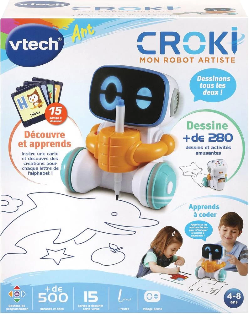 Un robot intelligent pour dessiner et apprendre à coder ! Pour dessiner avec Croki, rien de plus simple, il permet, grâce à ses trois modes de jeu, + de 200 possibilités de créations : Dessin avec carte préprogrammée : insérer une carte dans le sac à dos de Croki pour lui faire reproduire le dessin sur une feuille, il invite ensuite l’enfant à compléter le dessin et à le personnaliser. Dessin libre : le robot choisit lui-même un jeu/dessin et invite ensuite l’enfant à participer. Il peut par exemple lui demander de suivre les pointillés pour compléter le dessin ou de créer la suite du dessin par symétrie (99 modèles disponibles). Programmation : en utilisant les flèches, l’enfant programme une séquence et regarde Croki réaliser le dessin comme par magie. Il peut aussi utiliser les codes secrets pour débloquer des dessins secrets. Son visage s’anime et le rend expressif. 15 cartes de dessins préprogrammées recto-verso soit 30 dessins et 1 livret inclus avec 40 exemples de codage. 1 feutre inclus et système compatible avec la plupart des feutres du commerce (entre 7 et 10 mm de diamètre). 1 boîte de stockage pour ranger le feutre et les cartes. Fonctionne sur papier A4 ou A3. Arrêt automatique.