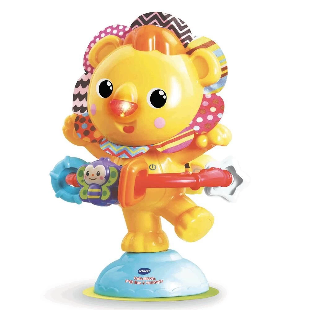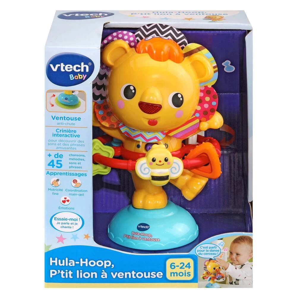 Hula-Hoop, p’tit lion à ventouse. De 6 à 24 mois. Une ventouse pour jouer et faire tournoyer le lion Hula-Hoop sans le faire tomber ! Trop rigolo ! Le cerceau autour du petit lion tourne et fait bouger les perles. Un bouton Musique sur la tête du lion pour déclencher des phrases, des musiques et des sons rigolos. Le nez du lion s’illumine en rythme avec les sons, mélodies et chansons. Différentes textures et des éléments à manipuler pour développer la motricité fine de Bébé. 3 chansons et 15 mélodies. Plus de 45 chansons, phrases, mélodies et sons amusants. Arrêt automatique.