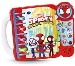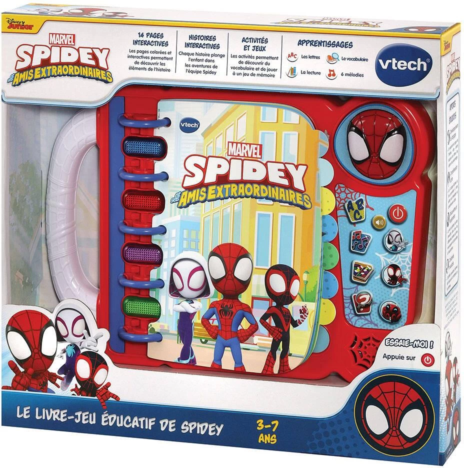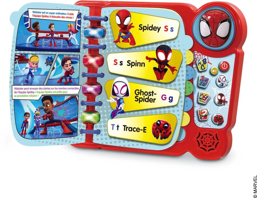 Un livre interactif pour plonger dans les aventures de l’équipe de Spidey et ses amis ! • 1 livre de 14 pages illustrées pour écouter et lire 7 histoires sur les aventures de Spidey et ses amis. • 7 pages pour découvrir les lettres et des mots de vocabulaire et 7 touches sensitives pour faire le plein de découvertes. • 4 modes de jeu : lecture, découvertes des lettres, musique et observation. • 4 boutons lumineux pour suivre l’histoire pas à pas et 1 bouton Spidey pour entendre la voix du personnage et des sons amusants. • Une poignée adaptée aux petites mains en forme de toile d’araignée. • Avec la vraie voix des personnages. • Arrêt automatique.