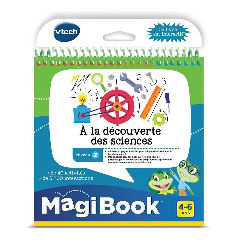 A la découverte des sciences. Compatible avec la plateforme éducative MagiBook. Livre de 32 pages illustrées pour découvrir les sciences de façon interactive. Apprentissages : -découverte des animaux, -découverte des plantes, -les différents types d’énergie, -résolution de problèmes. Des chansons, musiques et plein de voix amusantes pour guider l’enfant. Des autocollants inclus que l’enfant colle dans son tableau des récompenses au fur et à mesure qu’il progresse dans le livre et dans ses apprentissages. Contenu audio à télécharger en connectant la plateforme MagiBook à l’ordinateur (plateforme Explor@ Park). Livré sur barquette (possibilité de suspendre le livre).