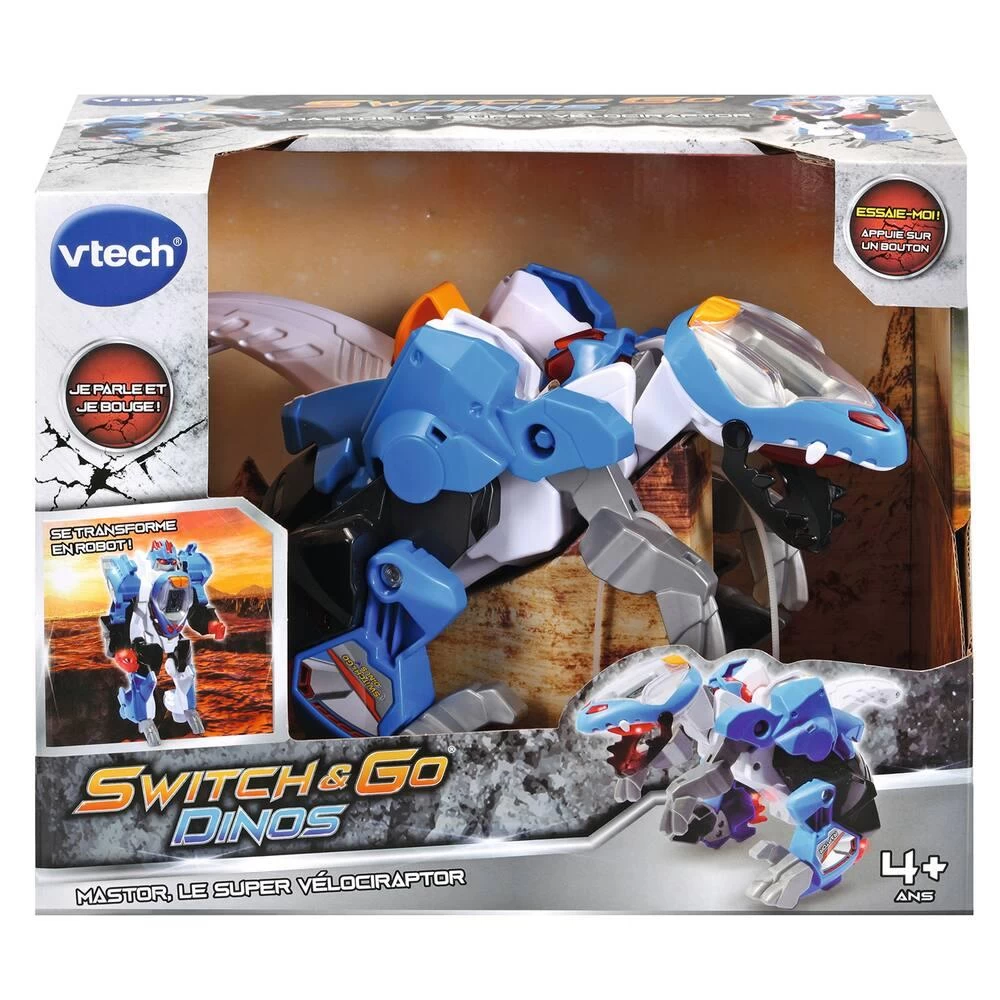 Switch and Go Dinos. Mastor, le super Vélociraptor. Un Vélociraptor à transformer en robot ! Deux modes : mode Robot et mode Dino. Chaque mode se déclenche automatiquement lorsque la transformation est effectuée. Écran LCD avec animations : robot et yeux de dino pour le mode dinosaure. Boutons pour déclencher les phrases et les effets sonores et bouton « Action » en mode Dino pour faire bouger les pattes et ouvrir la mâchoire du dino. La LED rouge dans la bouche du dino s’éclaire quand il ouvre la mâchoire pour cracher du feu. Avec des sons réalistes, des phrases liées à l’univers des dinos et des effets lumineux. Plus de 60 phrases et effets sonores réalistes. Arrêt automatique.