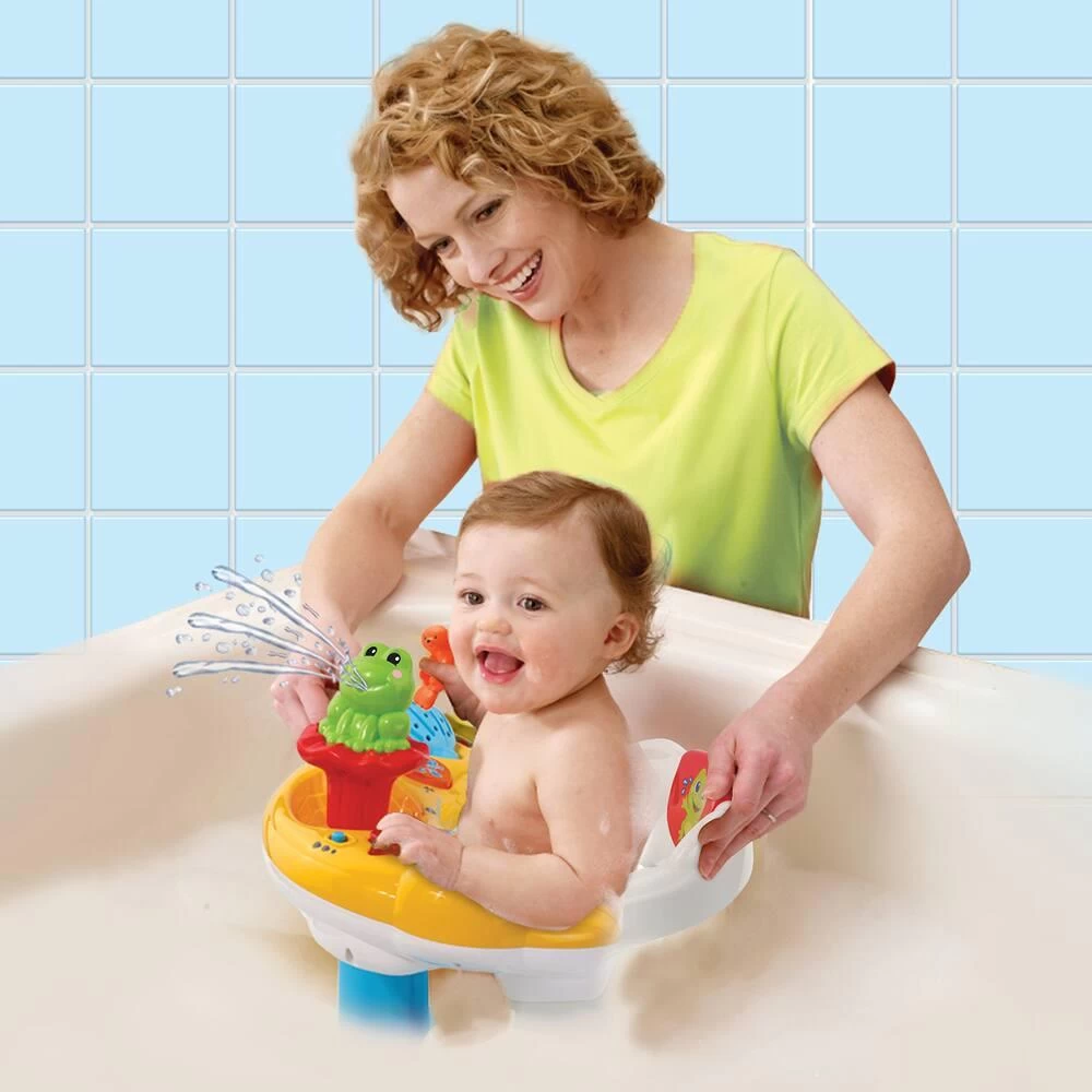 Super siège de bain interactif 2 en 1. Un siège de bain sĂ©curisĂ© grâce Ă ses quatres grosses ventouses et son tableau d’activitĂ©s amovible. Une grenouille farceuse rotative qui projette de l’eau sur BĂ©bĂ©. 4 boutons lumineux pour dĂ©couvrir les formes et les animaux, apprendre Ă compter et dĂ©couvrir de jolies mĂ©lodies. Plus de 70 phrases, chansons, mĂ©lodies et sons amusants. 3 chansons et 15 mĂ©lodies. RĂ©glage du volume sonore et arrĂŞt automatique.