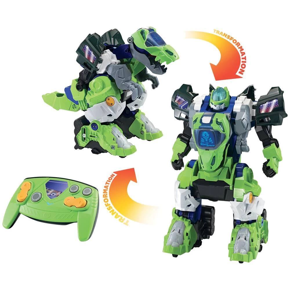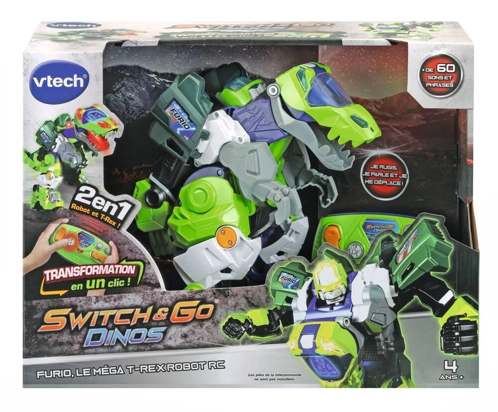 Furio, méga T-Rex robot radiocommandé. Un super T-Rex interactif qui se transforme automatiquement en méga Robot parlant ! Avec radiocommande dans les 2 modes : marche avant, arrière, droite, gauche. Un écran LCD rétro éclairé couleur : les animations sont encore plus réalistes ! Les animations dans l’écran et les voix changent automatiquement lorsque la transformation est effectuée. Des sons réalistes, des phrases liées à l’univers des dinos ou du robot et de nombreux effets lumineux. Plus de 60 phrases et effets sonores réalistes. Arrêt automatique.