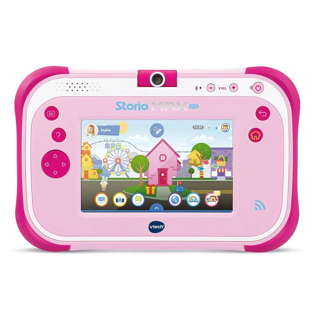 STORIO MAX 5 » 2.0 rose. De 3 à 11 ans. Maintenant en version 2.0 avec un design plus moderne ! Storio Max 2.0 possède une nouvelle interface avec des fonds d’écran en 3D animés qui évoluent avec l’enfant. Plus l’enfant personnalise son fond d’écran, plus celui-ci évolue. Et toujours des performances MAX :-Ecran couleur tactile capacitif HD multi-touch de 5 » réversible et sensible aux mouvements-Surf Internet grâce au navigateur Internet intégré et sécurisé (liste blanche)-Processeur rapide avec système Android 4.2-Batterie lithium rechargeable intégrée (rechargeable par USB)-Mémoire interne de 8 Go extensible jusqu’à 40 Go via une carte micro SD (non incluse)-Pavé directionnel pour une expérience de jeu encore plus intenseAu total, 20 applications/jeux intégrés (+2 à télécharger gratuitement), dont :-Kid Connect : pour garder le contact avec ses proches, en envoyant des messages (photos, vidéos, audio, dessins, textes) sur leur tablette/smartphone-Lecteur de livres numériques-Console de jeux éducatifs avec capteur de mouvement : 3 jeux inclus-Studio de dessins et coloriages-Appareil photo rotatif (2 MP), album photo, studio photo-Caméscope, lecteur vidéo pour regarder des dessins animés-Lecteur de musique (prise casque ou haut parleur)-Outils pratiques : horloge, chronomètre, calendrier, bloc-notesContrôles parentaux : accès WiFi, gestion des sites Internet autorisés, temps de jeu, profils utilisateurs…Evolutive via les cartouches de jeux Storio et plus de 2000 applications Android et autres contenus développés par VTech et par nos partenaires à télécharger sur l’Explor@ Park. Accès à une boutique d’applications Android.Ports USB, casque et adaptateur secteur. Câble USB inclus.Fonctionne sur batterie lithium rechargeable (intégrée), adaptateur de recharge inclus. Boîte fenêtre avec rabat. L’application Kid Connect pour smartphones Android® et Apple® est disponible en France (France métropolitaine et Corse), Suisse, Belgique, Luxembourg, Espagne, Italie, Pays-Bas, Allemagne, Autriche, Irlande, Royaume-Uni, États-Unis et Canada.